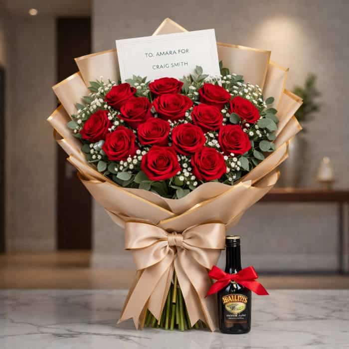 Envíale este espectacular ramillete de mano o bouquet de 12 rosas y follajes verdes (sin base) acompañado de una Botella de Baileys de 375ml y déjalo sin palabras.